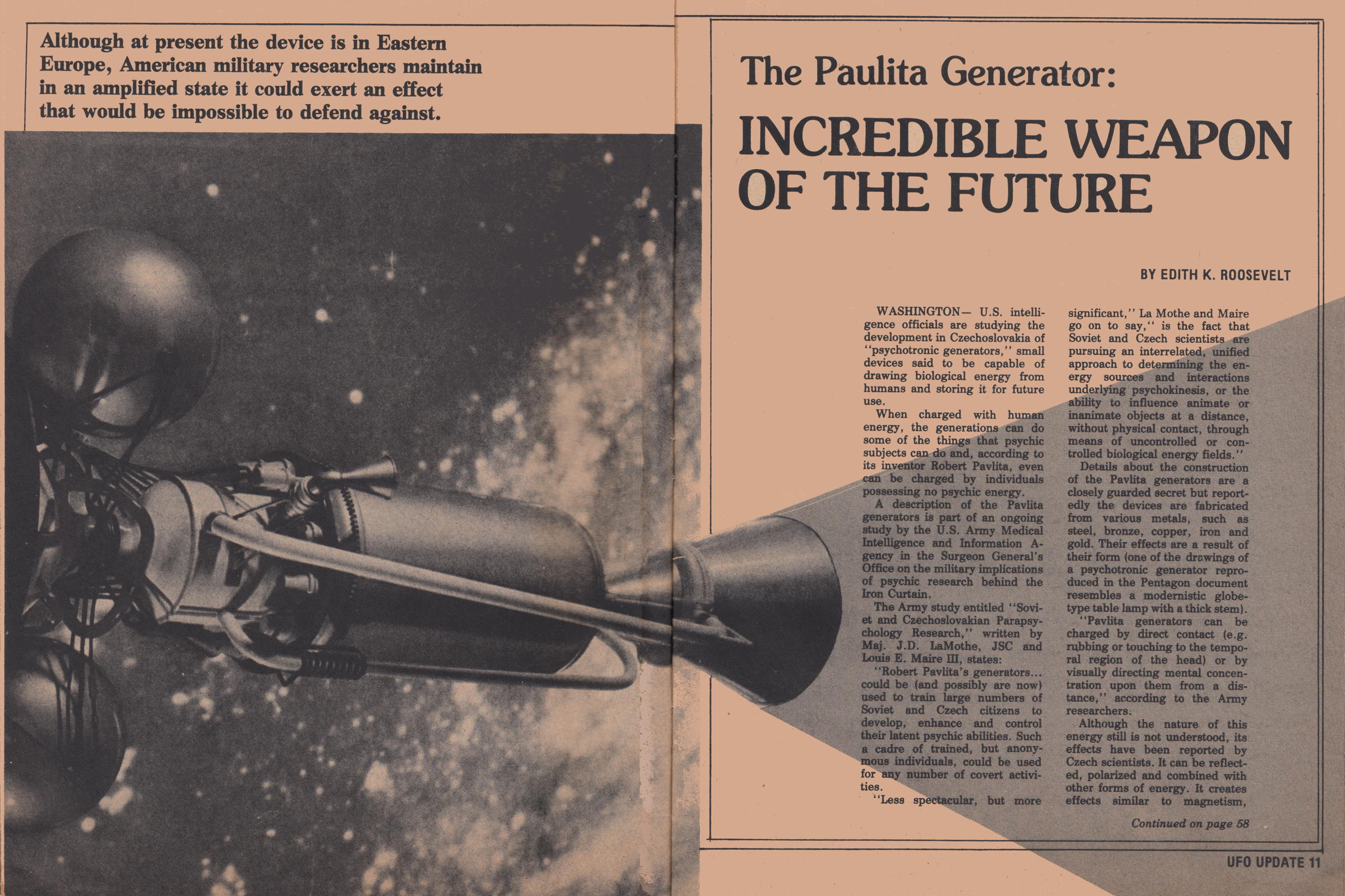 My article is titled The Paulita Generator: Quantum Soldiers of the Future (PDF File, 6.8 MB). The real article was titled “The Paulita Generator: Incredible Weapon of the Future”. If you want to look it up, it’s in UFO Update Summer 1980. I suspect that the actual article’s Edith K. Roosevelt is just as pseudonymous as my fake article’s Monica Alexander, for obvious reasons. And I liked the typo in the subtitle of the original so much that I kept it for my fake version. The magazine’s cover had the same typo, referring to the device as a “Paulita Generator”. The device was correctly identified as a Pavlita Generator throughout the article itself.